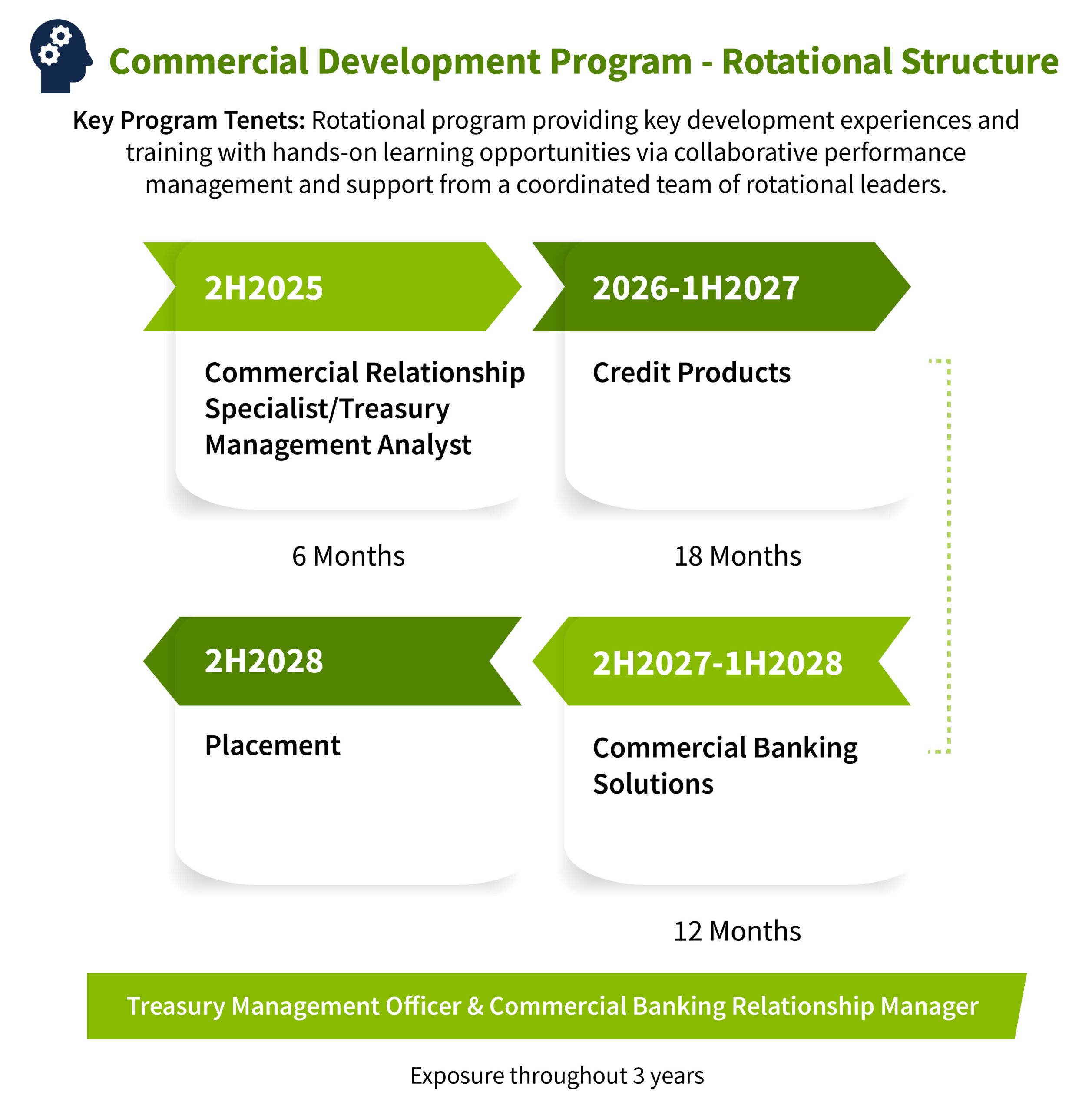 Since the Commercial Development Program began in 2022, Corporate Banking Group has hired 12 analysts into this rotational experience. The 2025 cohort will consist of an additional six hires joining Regions this summer, positioned across growing Regions markets. In 2024, the program also expanded to a three-year duration, consisting of six months in Treasury Management, 18 months in Credit Products, and 12 months in Commercial Banking Solutions.