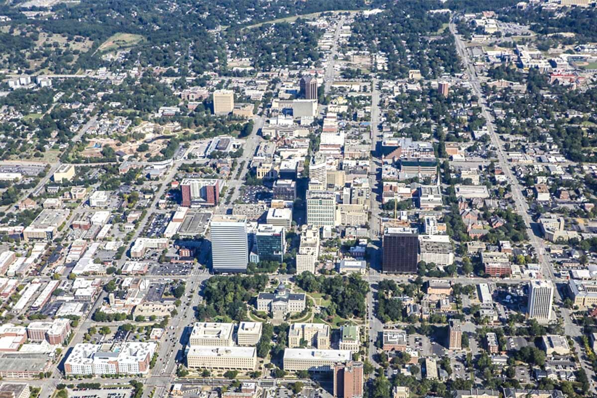 An impressive view of downtown Columbia from a few thousand feet above. The South Carolina State House is in the foreground.