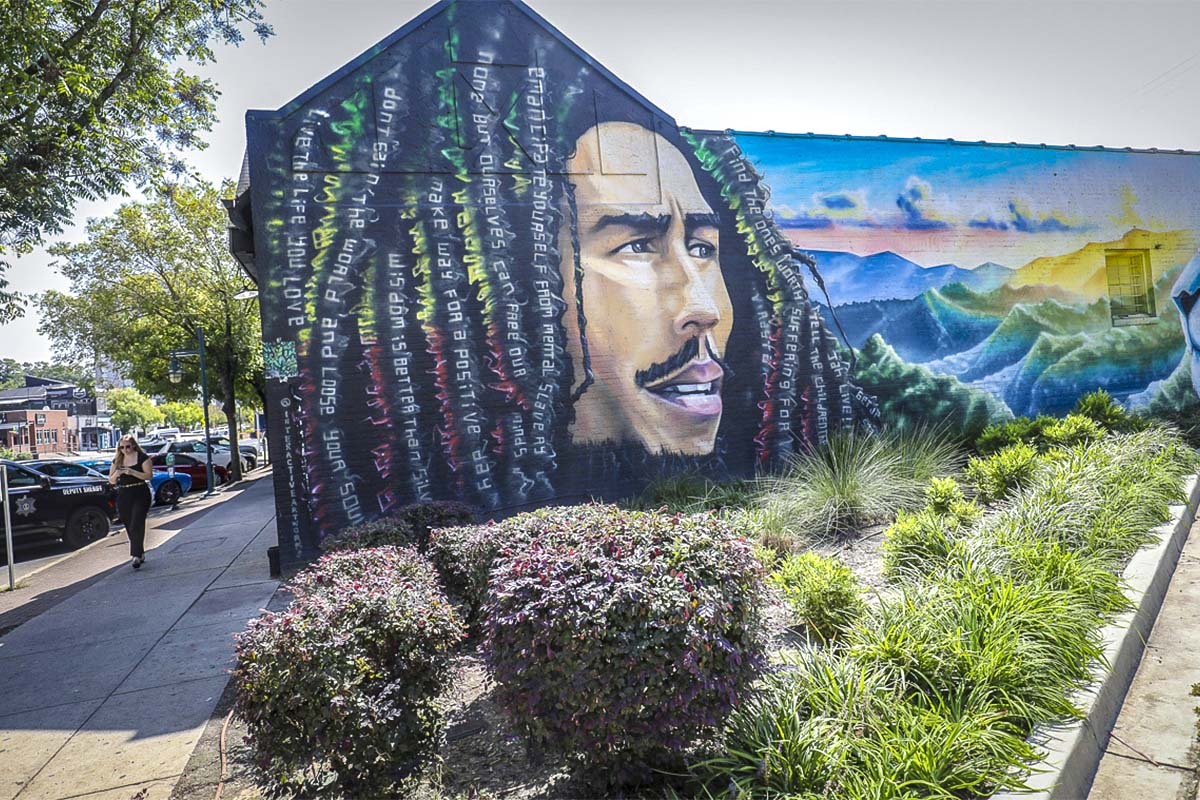 • A mural of music icon Bob Marley can be found in Columbia’s Five Points neighborhood. Called “The View from Mount Zion,” the mural includes a rendering of Marley’s face and hair with a lion.