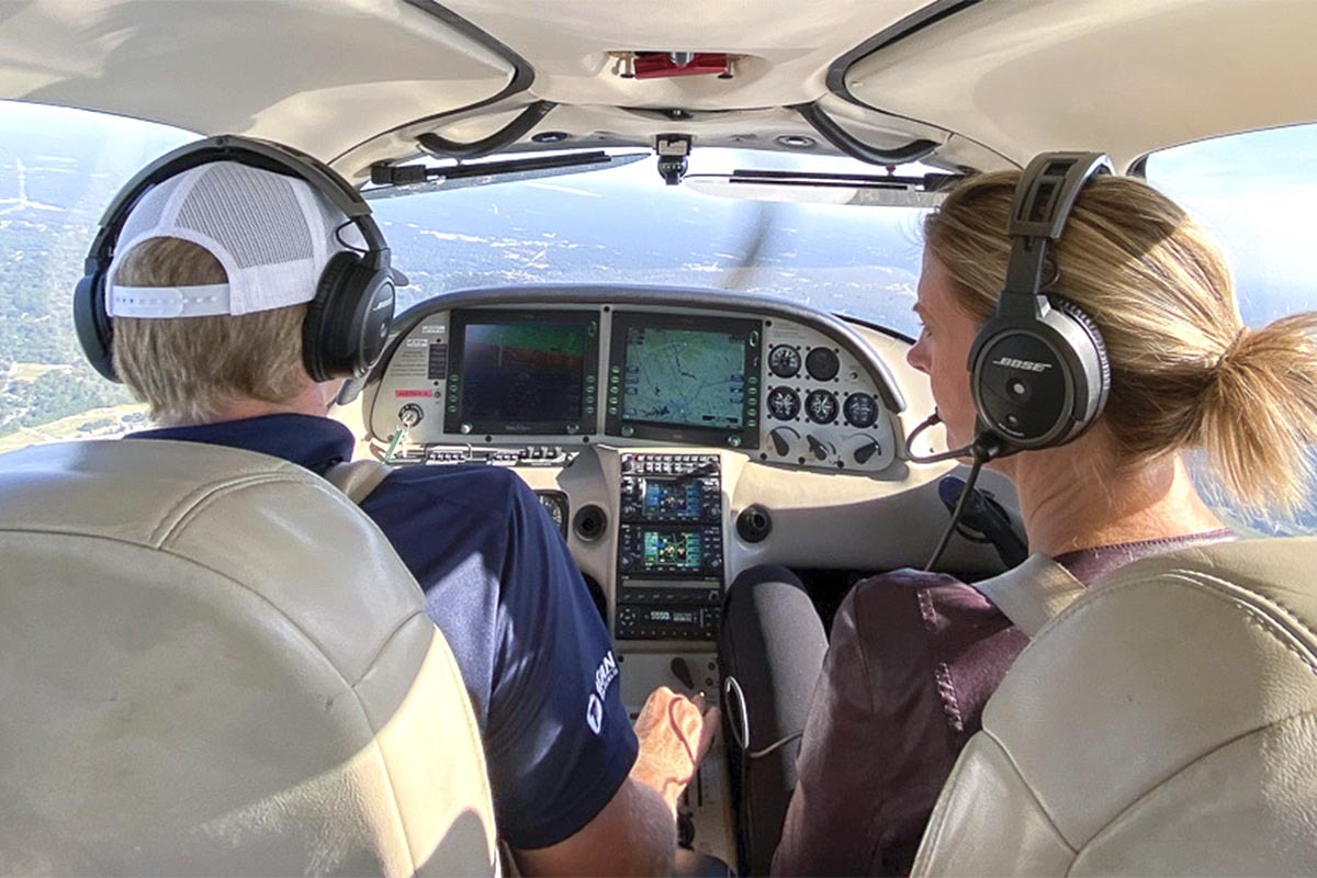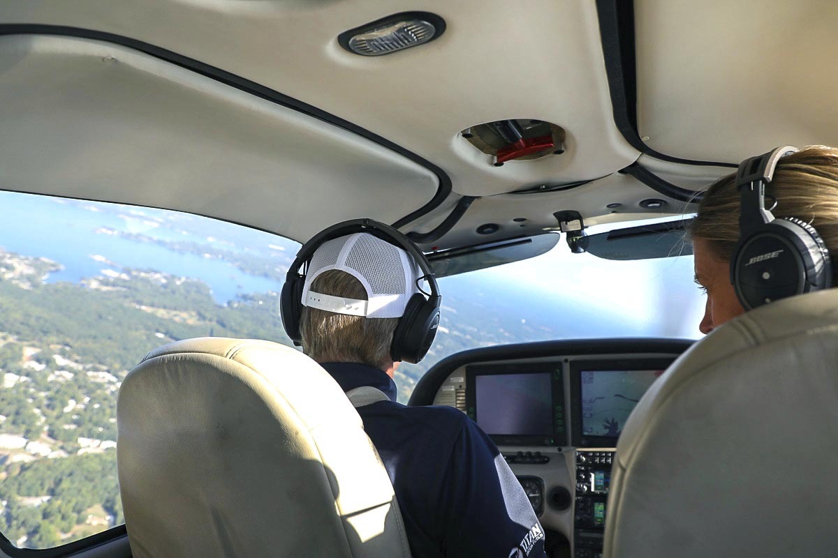 Pilot Connor Brandon communicates with Lisa Burgess using state-of-the-art headphones and mic while in the air.