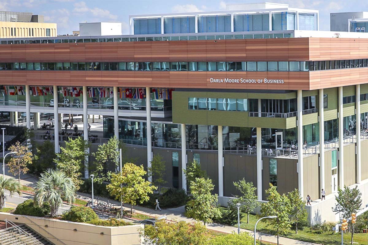 • An exterior shot takes in one of the crown jewels of the University of South Carolina campus: the Darla Moore School of Business, the home for 5,500 undergraduate students and another 800 grad students.