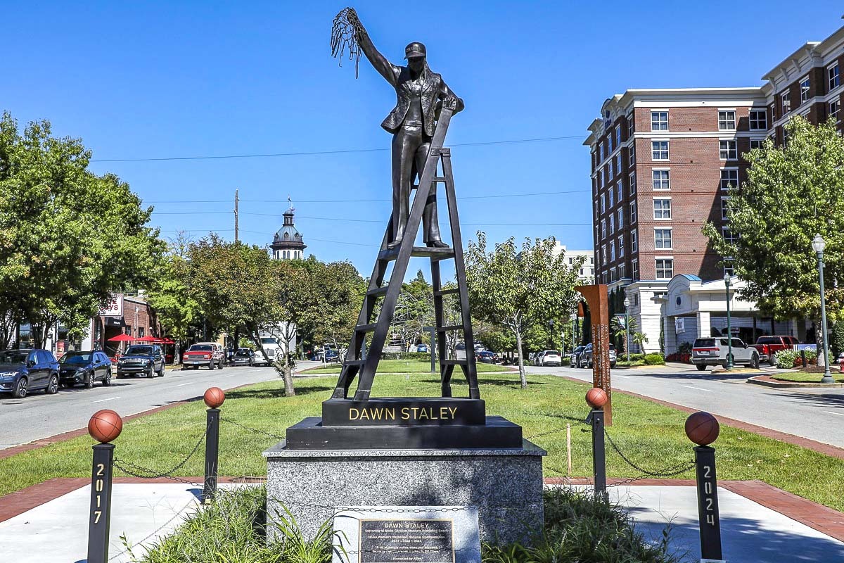 • Another downtown art exhibit: a sculpture of South Carolina women’s basketball coach Dawn Staley atop a ladder after cutting down the net following a national championship victory.