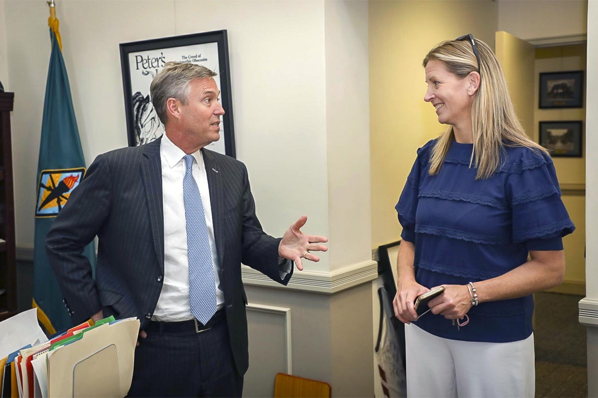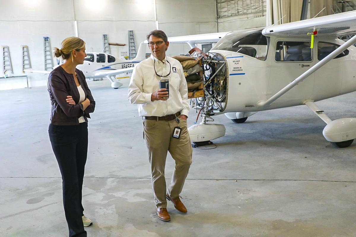 Eagle Aviation CEO Lee Thomas and Lisa Burgess talk on the tarmac before taking a flight above the city.