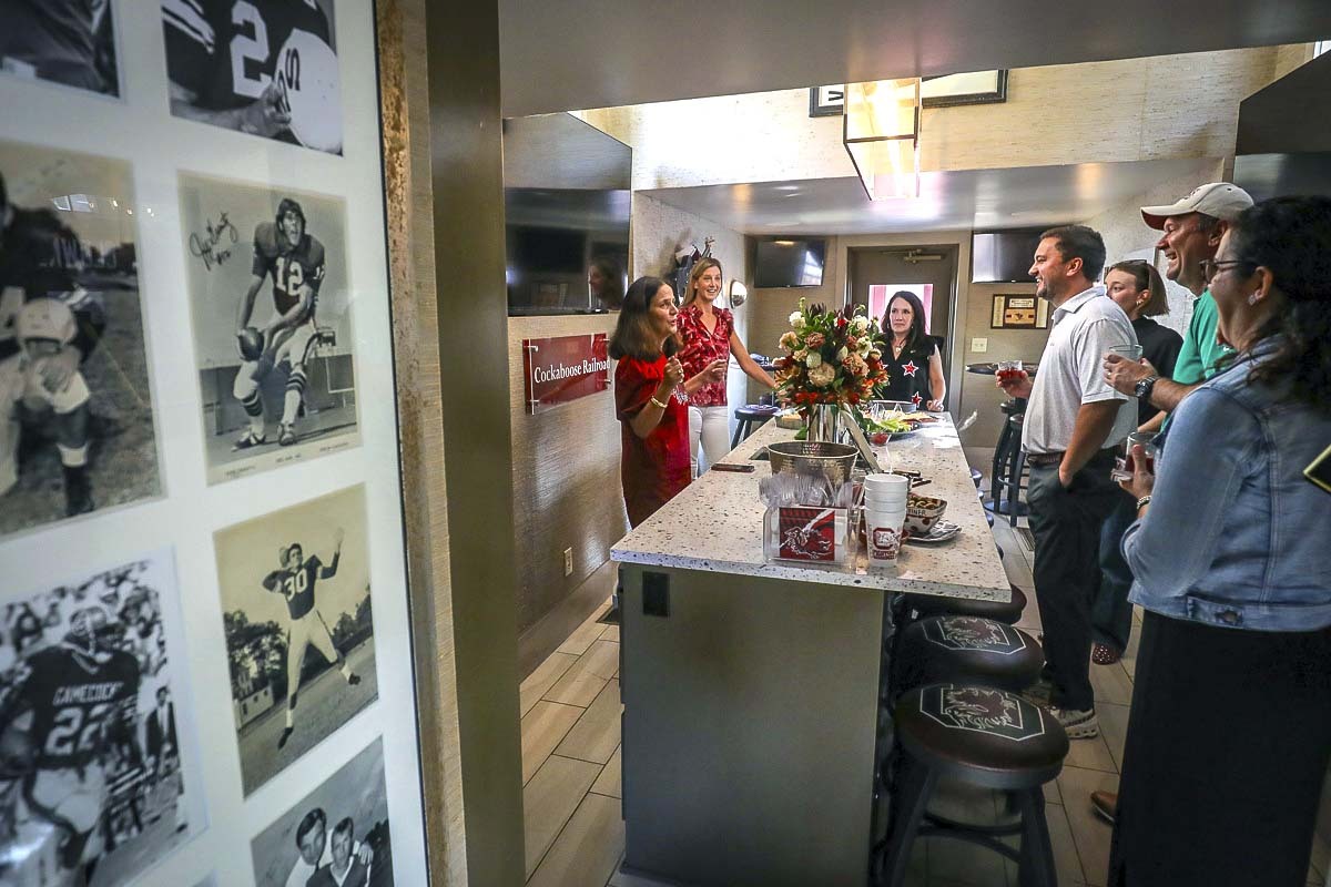 • Paige Haas with visitors in the kitchen of her Cockaboose, a converted railcar. Haas entertains in front of the kitchen island. In the foreground is a wall of photos of former Gamcock football greats.