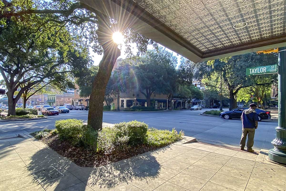 The early-morning sun peaks through next to a branch of an oak tree on a quiet corner of downtown Columbia.