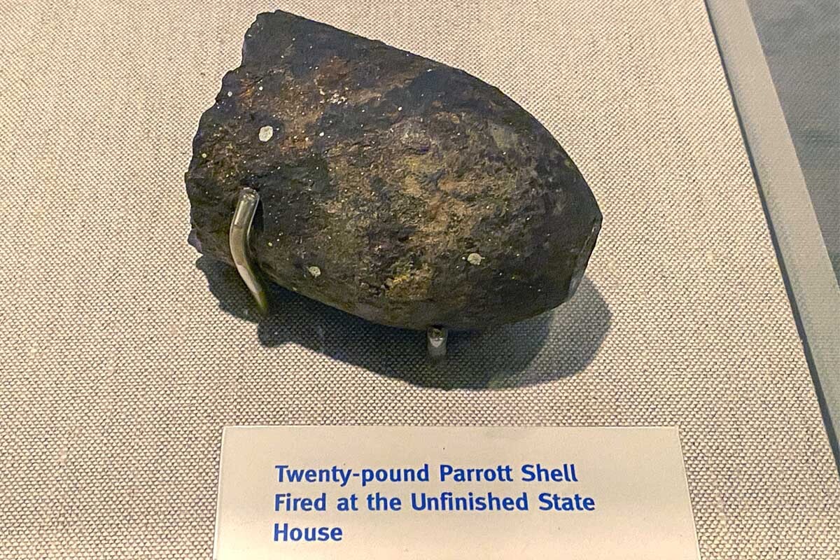 • The remnants of a 20-pound shell, fired at the unfinished state house during the Civil War, on display at the history museum.
