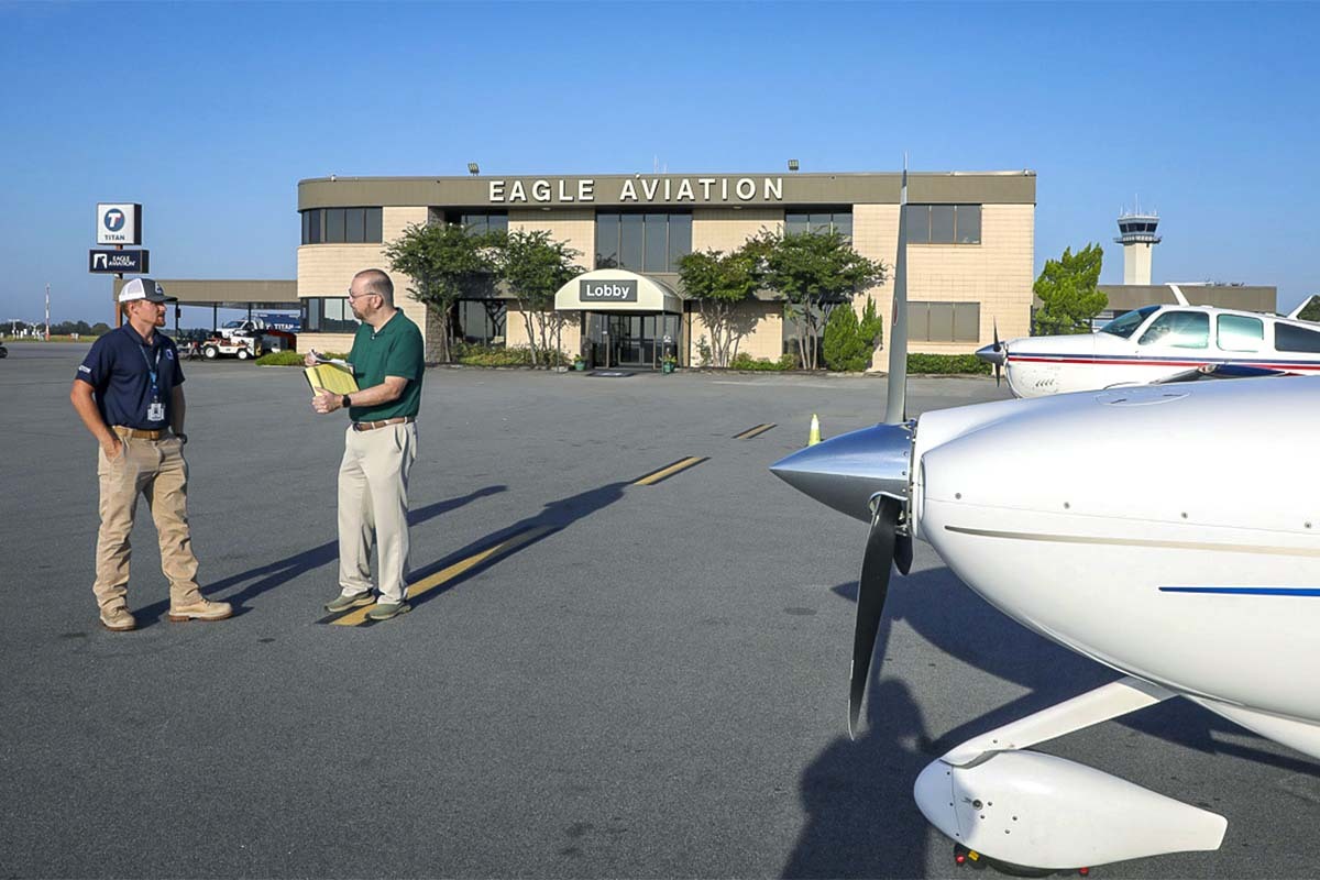 • Eagle Aviation CEO Lee Thomas and Lisa Burgess talk on the tarmac before taking a flight above the city.