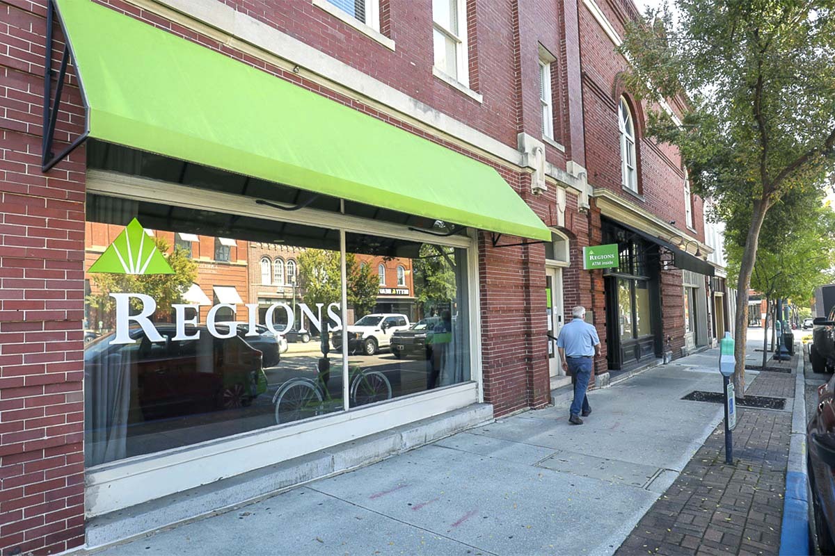 • A green awning helps make the exterior of the Regions building in downtown Columbia easily recognizable.