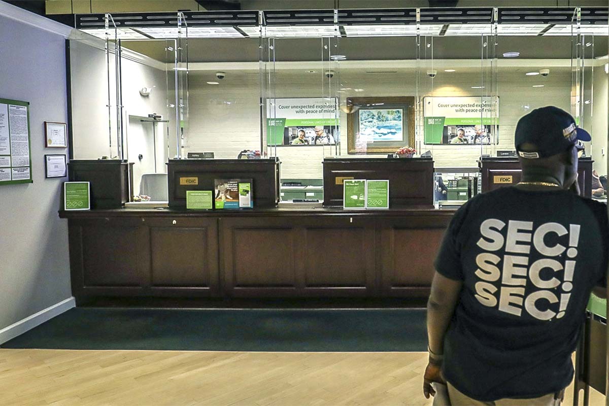 The T-shirt of the customer inside the Regions Bank branch proclaims, “SEC! SEC! SEC!” Yet another sign that college sports are big stuff in the Palmetto State.