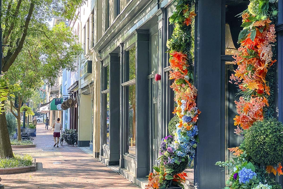 • Shade from trees and flowers adorning entrances greet visitors walking through downtown Columbia.