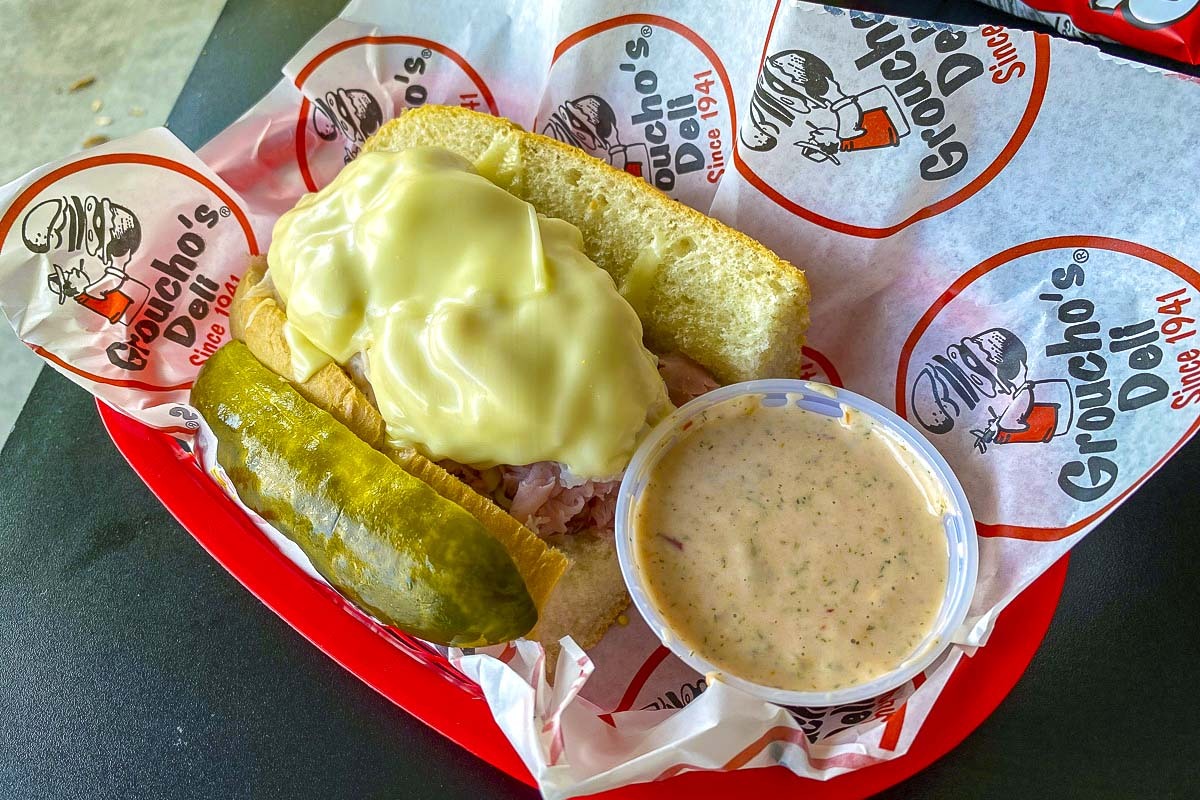 • Introducing the Apollo Dipper sub sandwich, with Swiss cheese melted over turkey and ham. It’s one of the most popular items at Groucho’s Deli, a popular eatery for USC students since 1941.