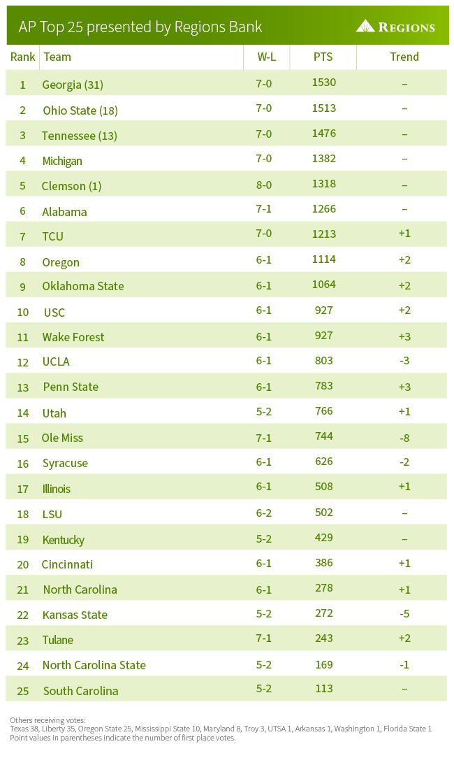 Georgia is No. 1 for the third straight week, with No. 2 Ohio State gaining ground after it blew out Iowa. The Bulldogs, who were idle, received 31 first-place votes and 1,530 points, and the Buckeyes got 18 first-place votes and 1,513 points.