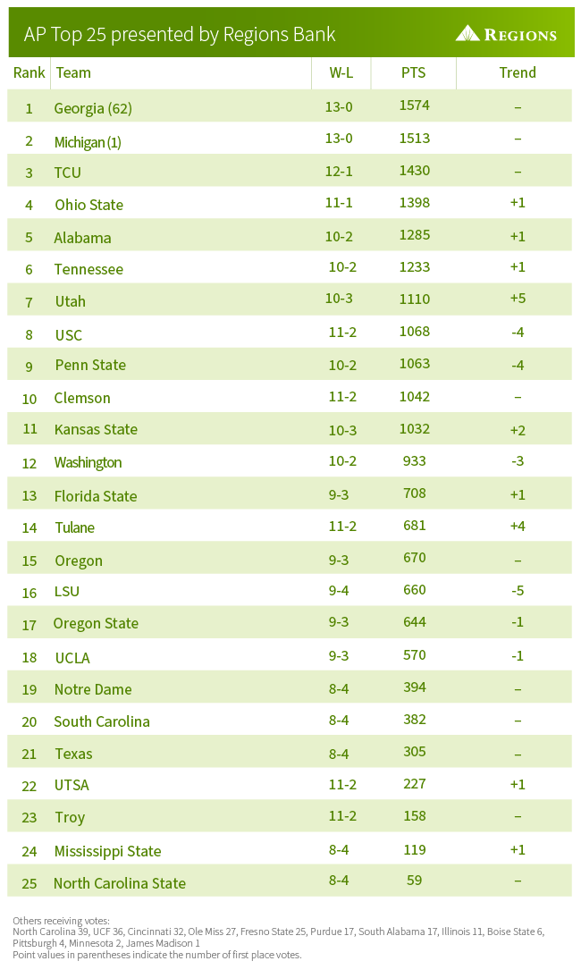 The Bulldogs (13-0) are No. 1 for the ninth straight week and 12th time this season in the AP Top 25 presented by Regions Bank. Georgia received 62 first-place votes and Michigan (13-0) received the other one in the poll released Sunday.