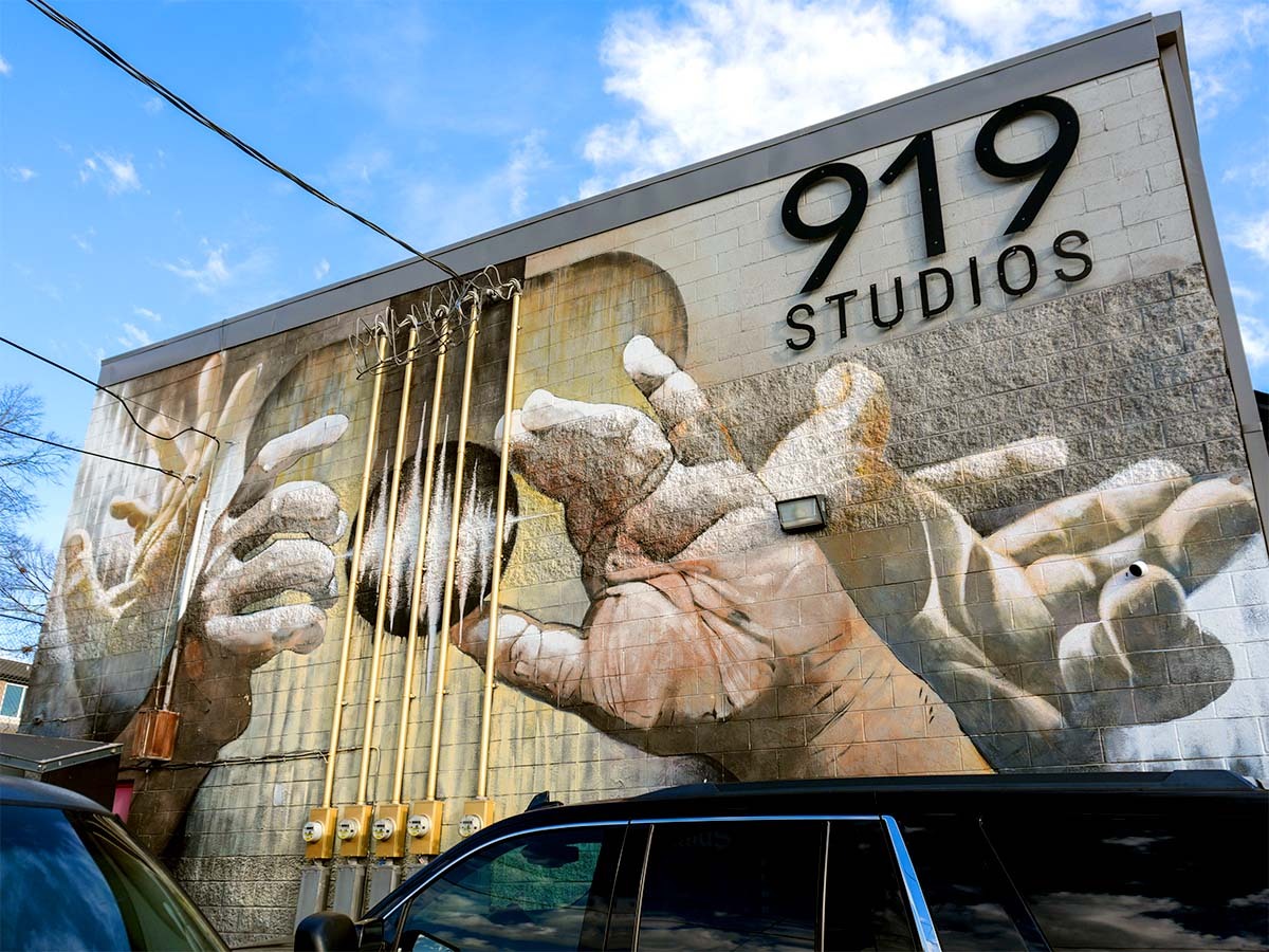 • Exterior 919 Studios mural showing hands surrounding a guitar.