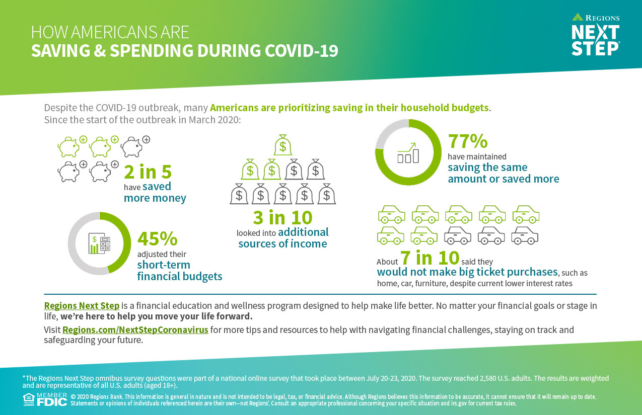 BIRMINGHAM, Ala. – Sept. 21, 2020 – The latest survey from Regions Next Step, Regions Bank’s financial education program, finds the majority of Americans surveyed (77%) have maintained saving the same amount of money – or saved more – since the start of the COVID-19 pandemic in March 2020.