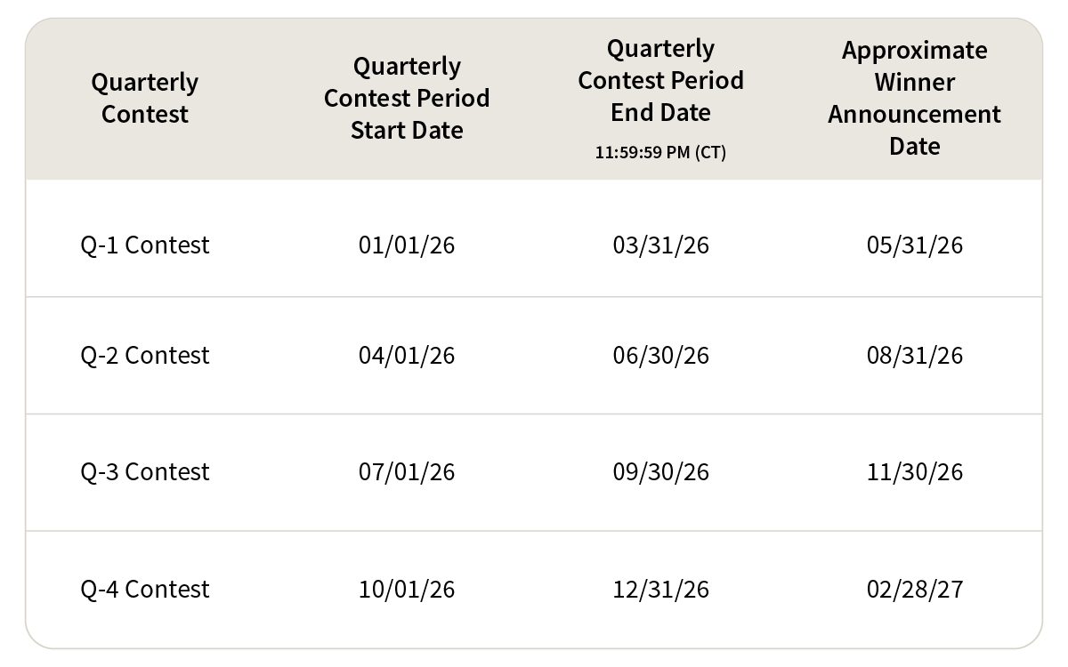 The entry deadline for each Quarterly Contest is 11:59:59 PM Central Time on the applicable Quarterly Contest period end date (set forth in the chart above).