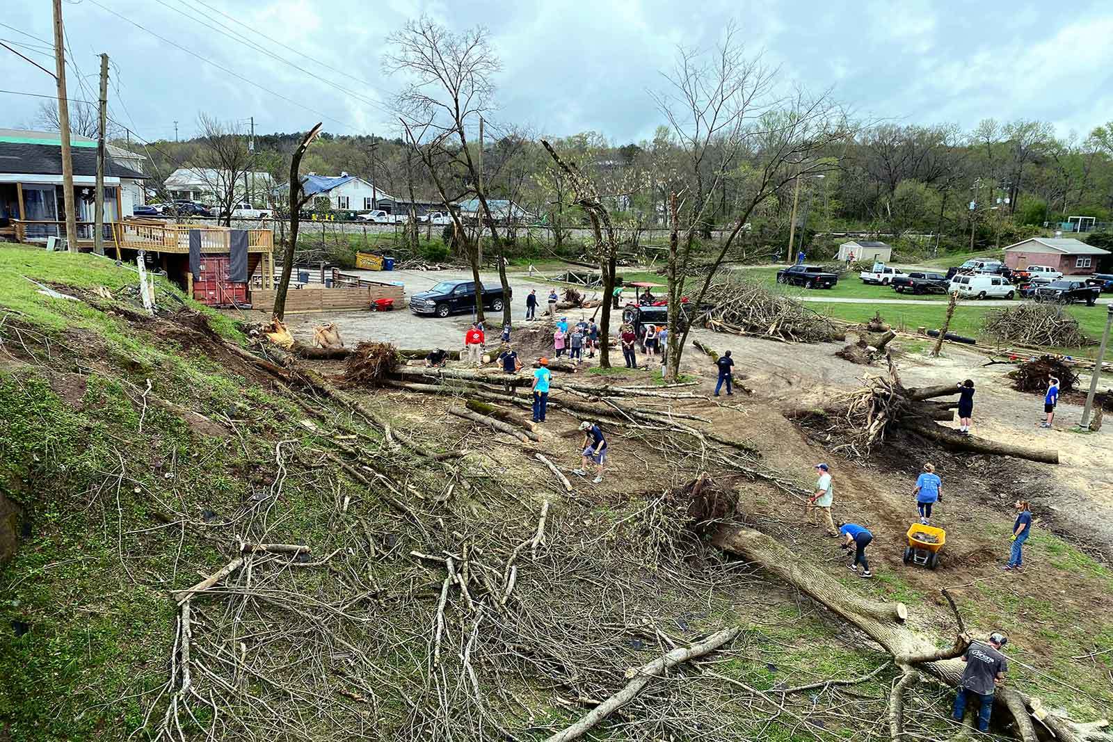 Community members show up in force to clean up Old Town Helena, which took a direct hit from one of several tornados to impact Alabama March 25. Regions Delivered supplies for people in Helena and other Shelby County communities impacted by severe weather.