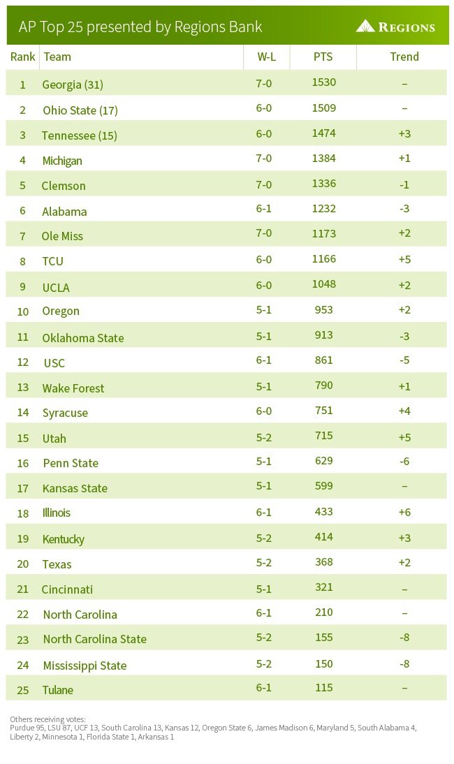 Georgia remained No. 1 and received 31 first-place votes and Ohio State had 17 first-place votes.